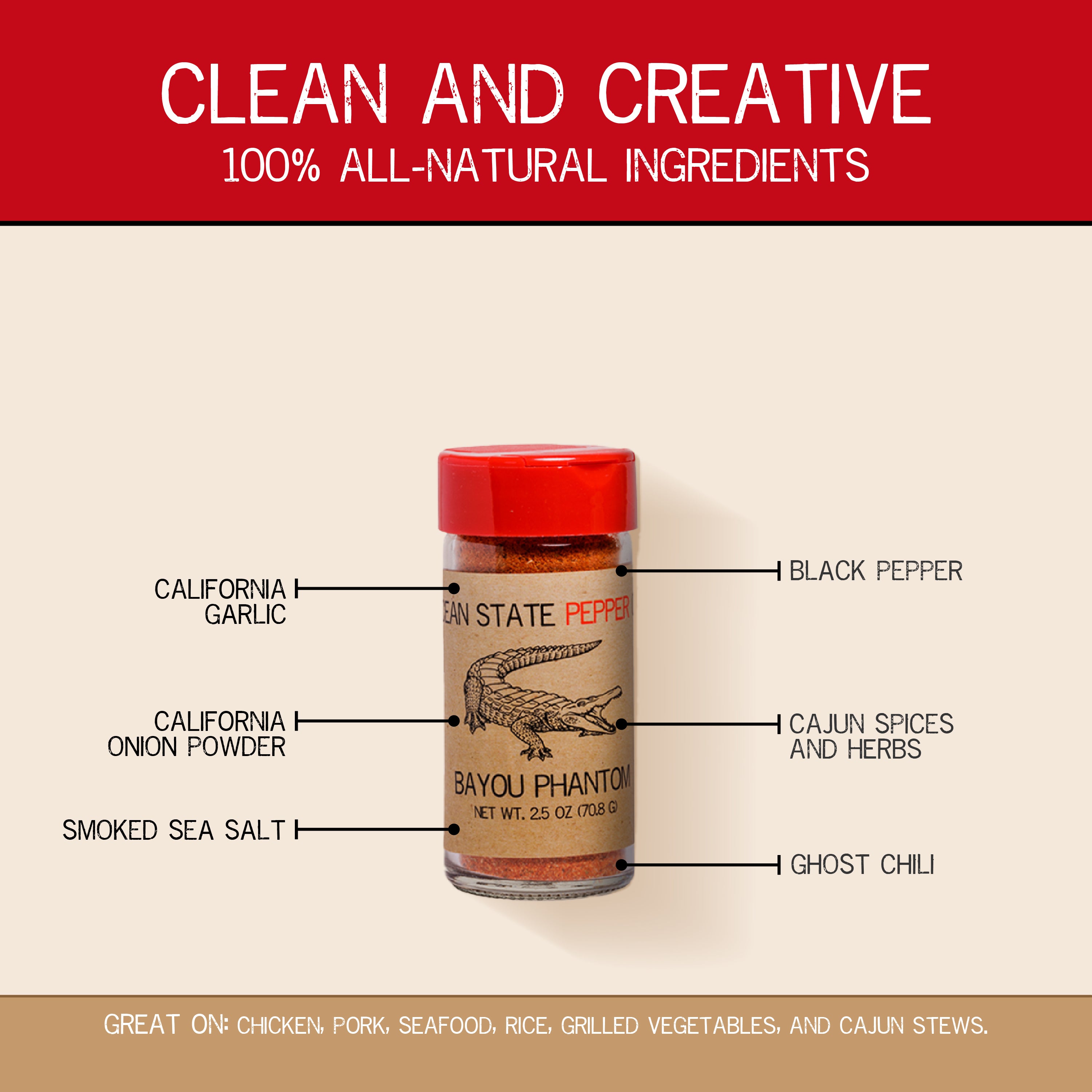 Our take on creole cooking brings the heat with the intense flavor of locally-farmed, fresh ghost chili powder, rounded out with pecan smoked sea salt, sweet paprika, and choice herbs which finishes this delicious Cajun seasoning. This spice blend is great for all things seafood, as well as chicken, rice dishes, and anywhere else you need some fire! Enjoy the perfect balance of flavor and heat with every bite.